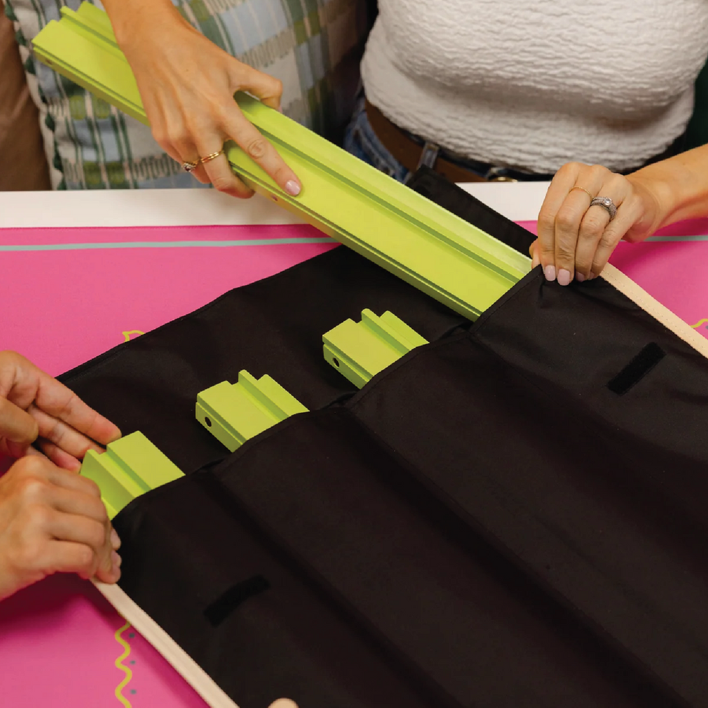 The Charleston was designed with Mahjong players in mind. This clever case neatly holds up to four racks (up to 20") inside secure slots, with an interior flap to keep them in place. It folds closed with an easy snap closure, making it simple to carry and store.